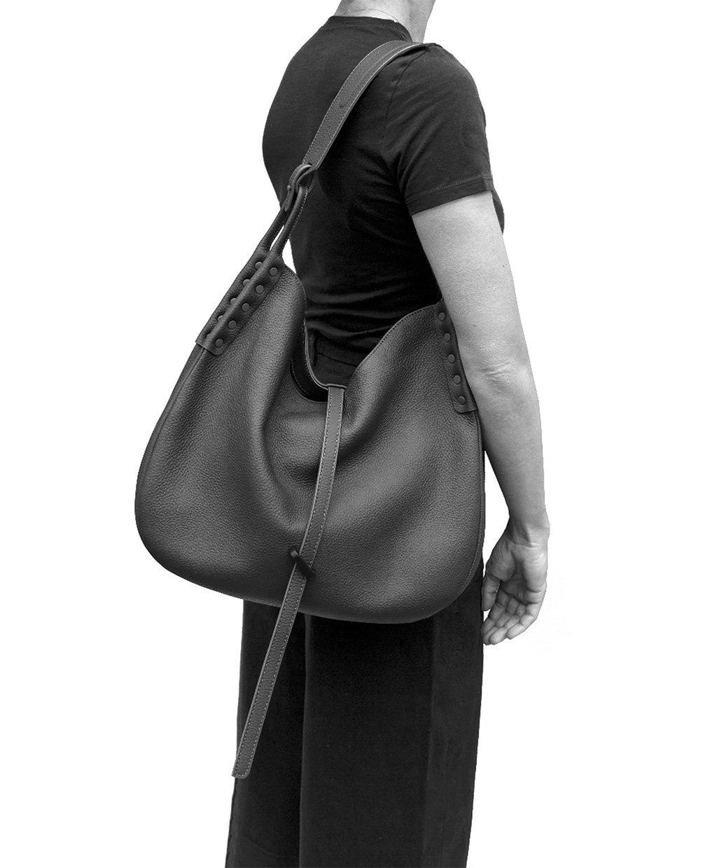 70年代のスタイルである「ホーボースタイル」をモチーフにデザインされたシリーズのひとつ。ラウンドしたボトム部分とバッグ上部を留める長いストラップがデザインのアクセントになっています。ハンドル部分は固定されループ状に作られており、ショルダースタイルをベースにクロスキャリーも楽しめるデザインになっています。