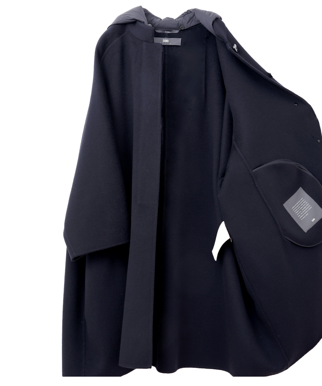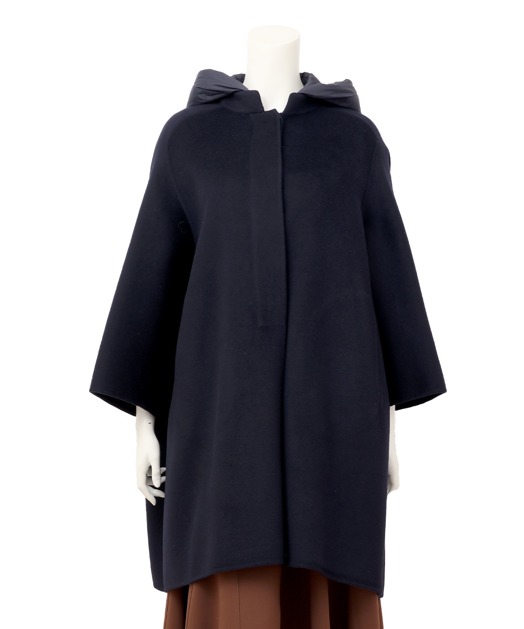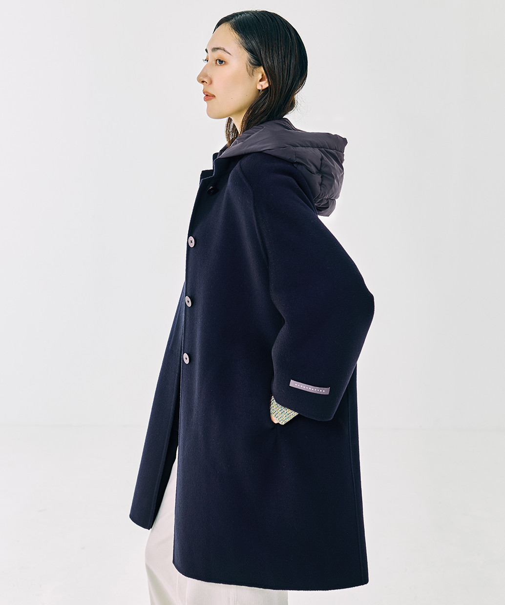 組成 | 表地:毛90% カシミヤ10% 第二の布地:ナイロン100% 裏地:ナイロン100% フード:(詰め物)ダウン90% フェザー10% |