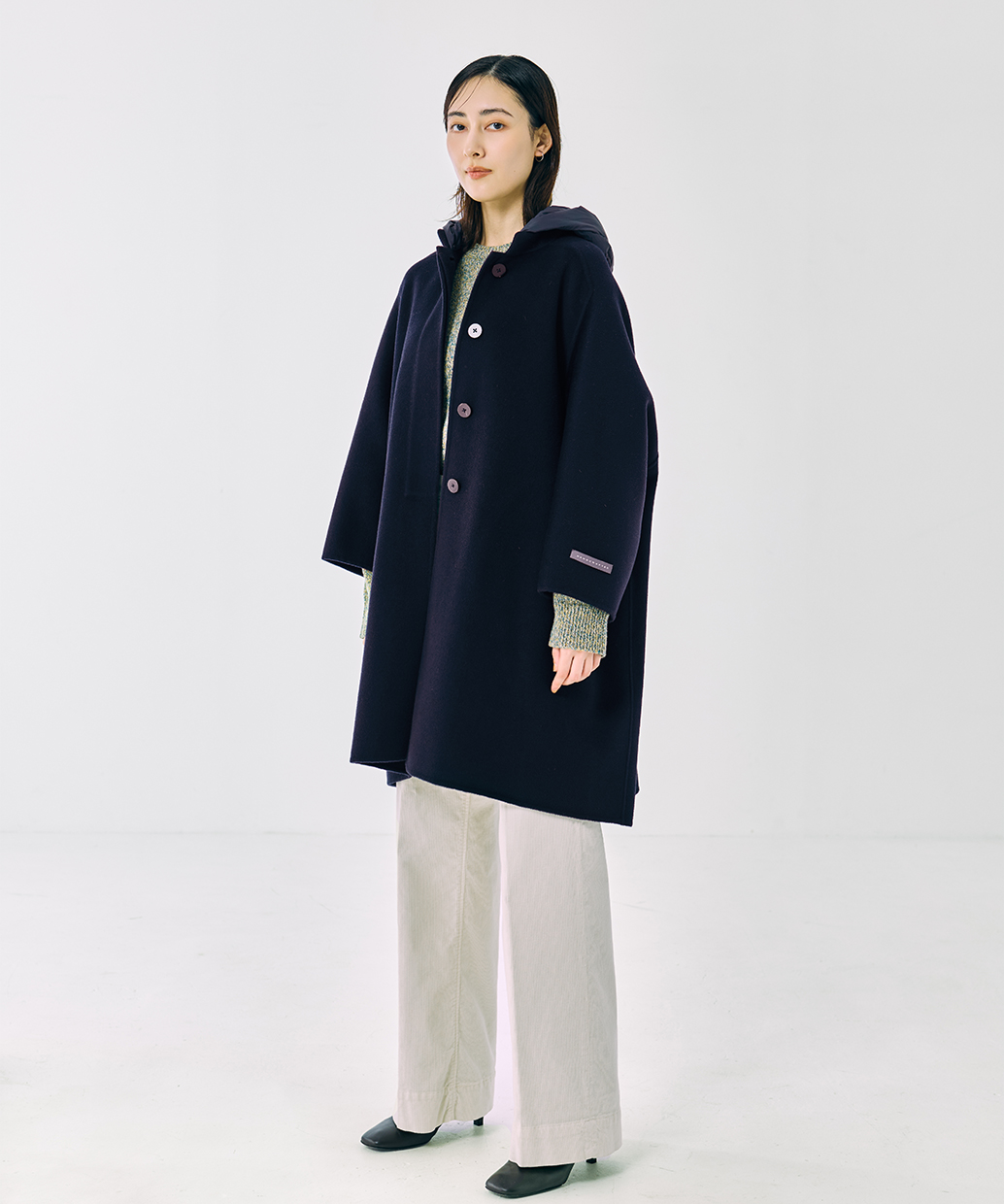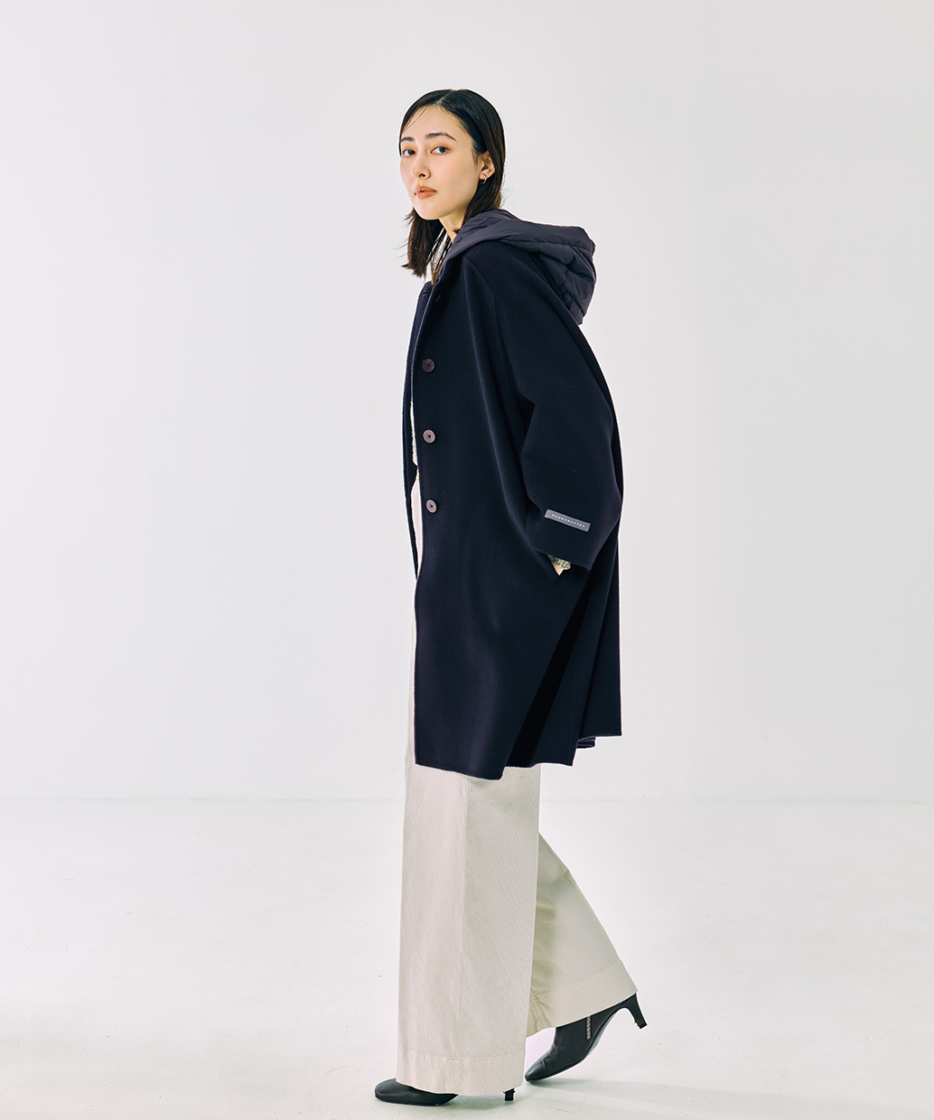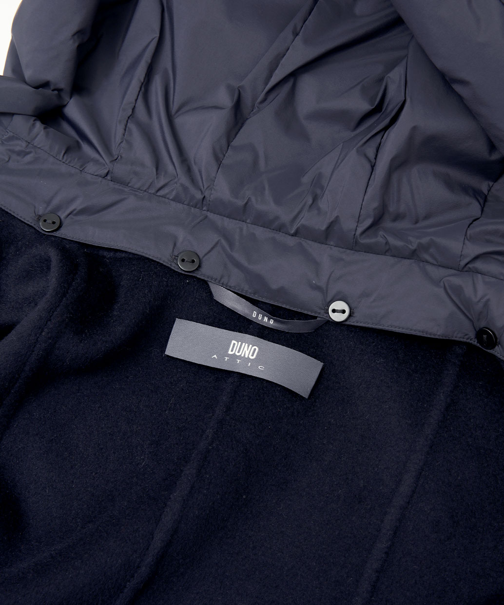 組成 | 表地:毛90% カシミヤ10% 第二の布地:ナイロン100% 裏地:ナイロン100% フード:(詰め物)ダウン90% フェザー10% |