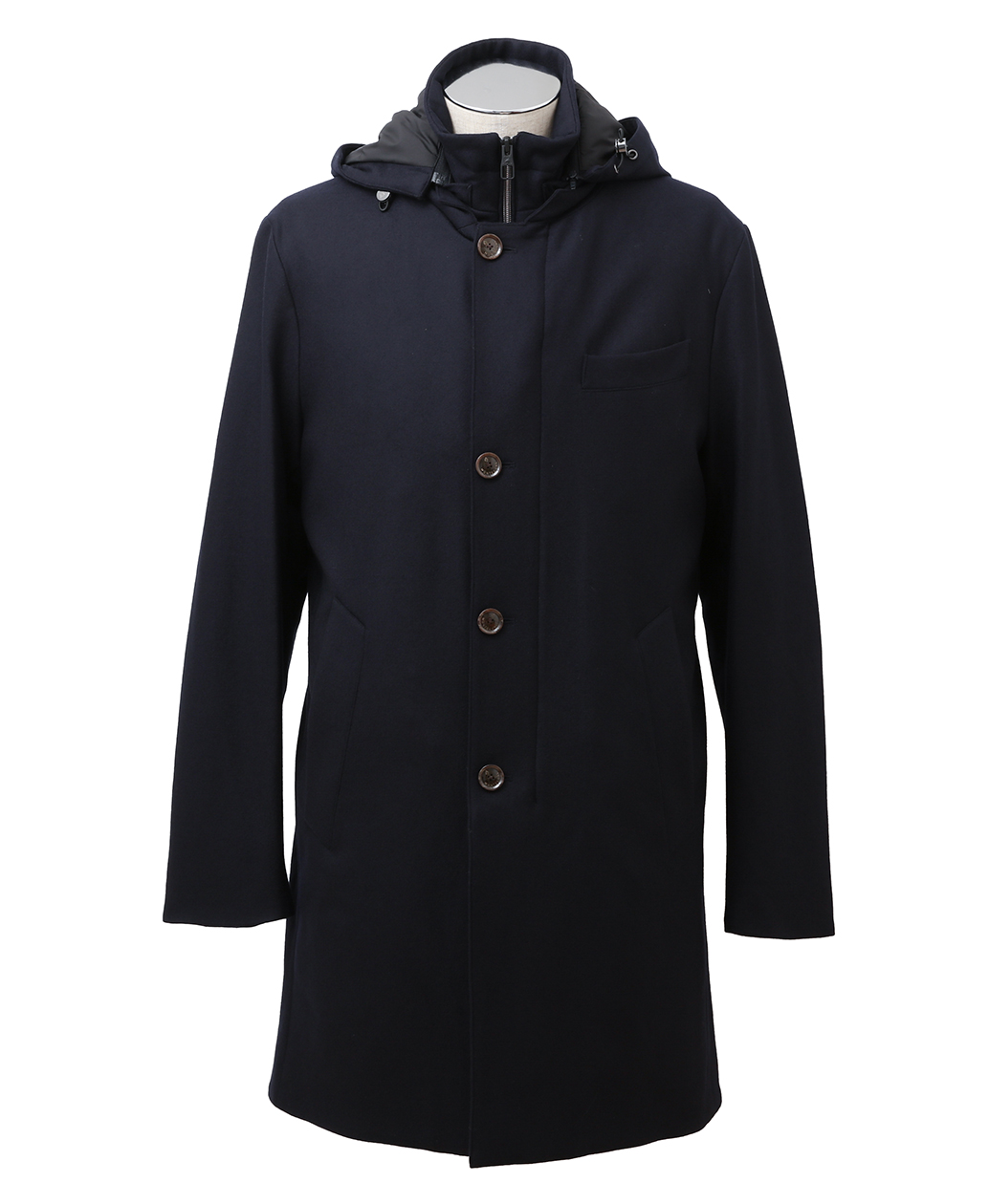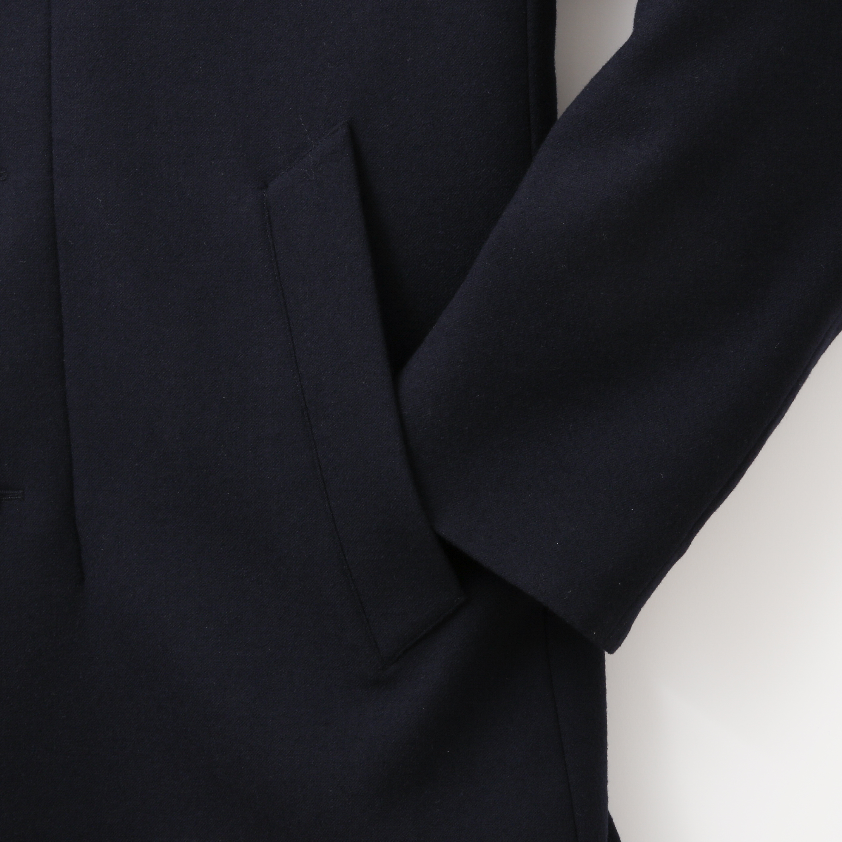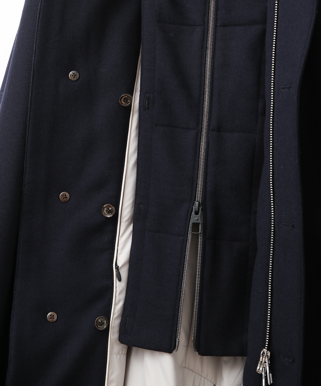 前立て・フードの着脱仕様、内側の美しいパイピングやバルカポケット、センターベントのスナップボタンなど、実用性にもこだわり抜かれています。