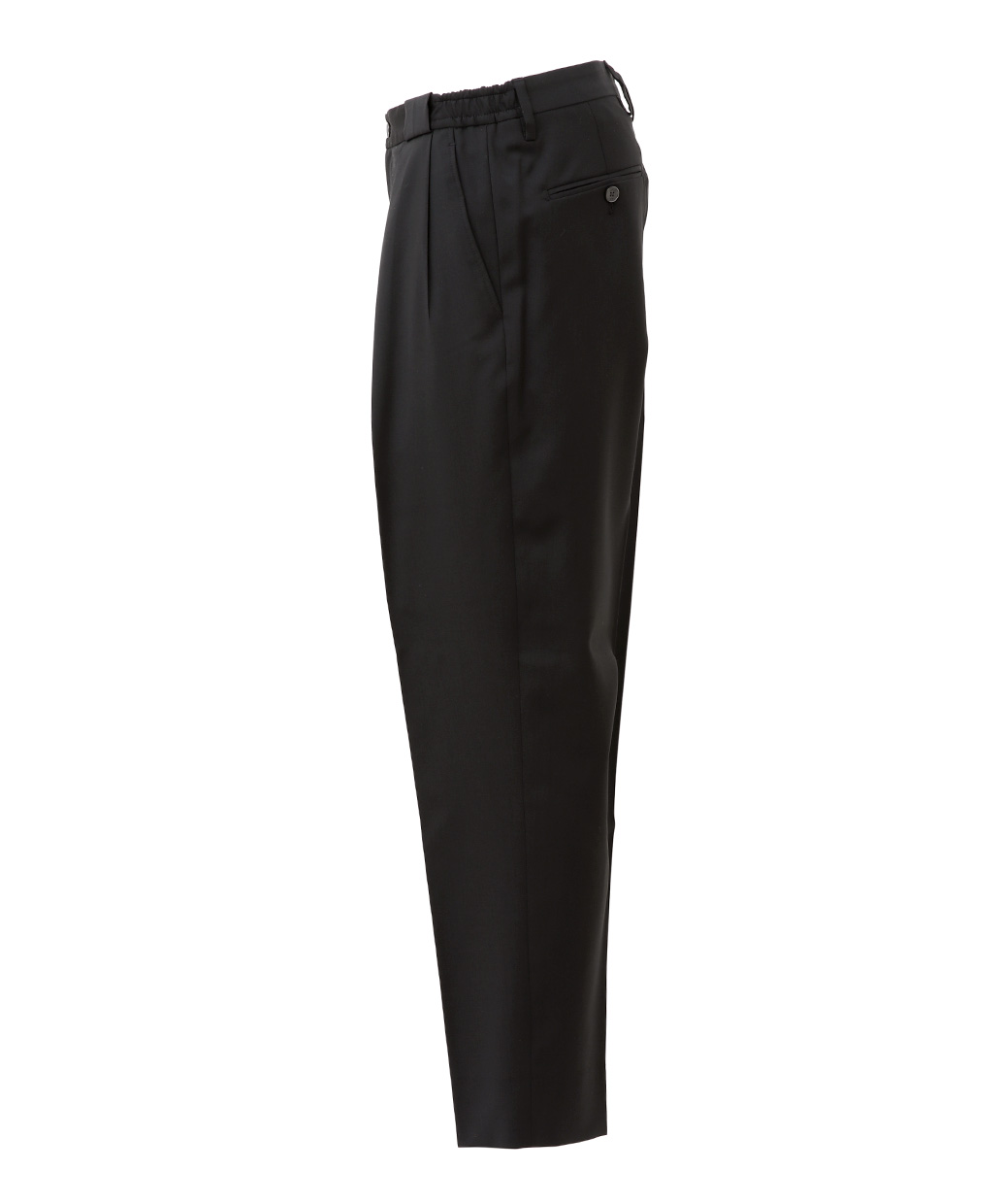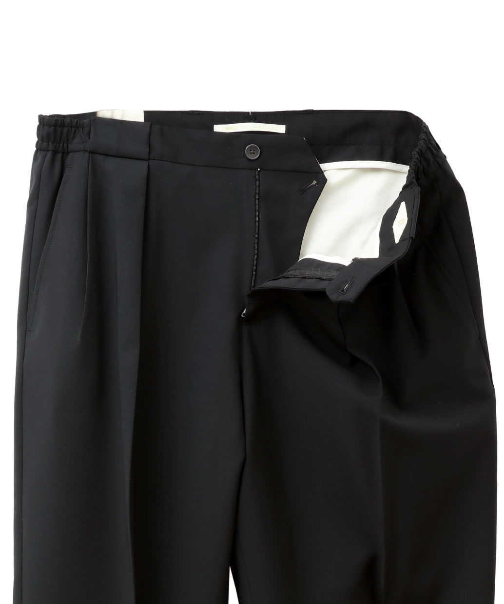 プリーツはイン&アウトの2プリーツ仕様を採用し、腰まわりにゆとりを持たせながら、裾に向かって美しく絞ったワイドテーパードシルエットに。動くたびに生まれる自然なドレープが、リラックス感の中にも洗練された印象を演出します。ウエストはサイドのみシャーリング仕様とすることで、イージーな穿き心地と端正な見え方を両立しています。